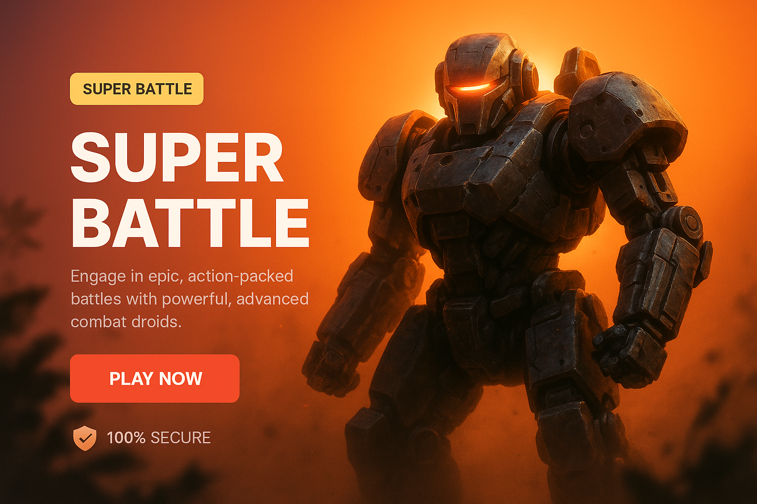 A visually striking promotional graphic for a game titled 'Super Battle', showcasing a robotic character amidst a dramatic background. Ideal for attracting gamers.