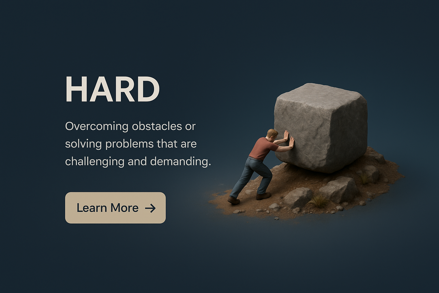 A zoomed-out 3D scene showcasing a figure struggling with a large rock, symbolizing challenges. The dark gradient background enhances focus on the small-scale elements in the foreground.