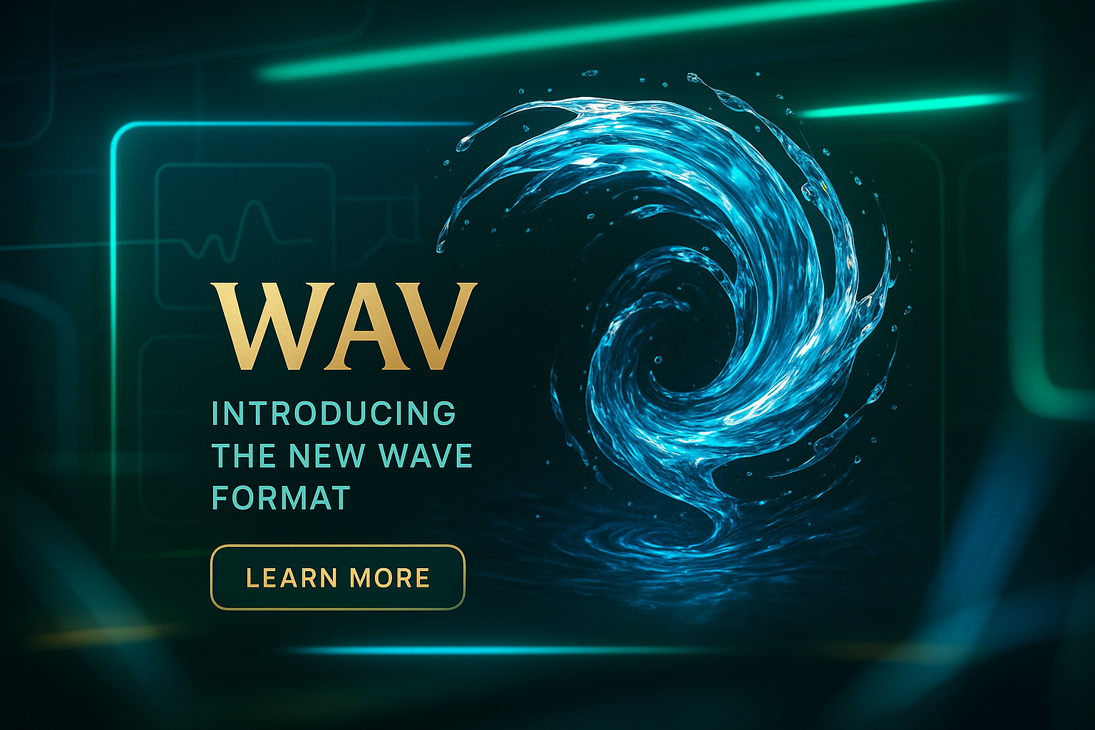 Stylish digital graphic announcing the new WAV audio format, featuring a swirling water motif and vibrant colors. Ideal for tech-related promotional content.