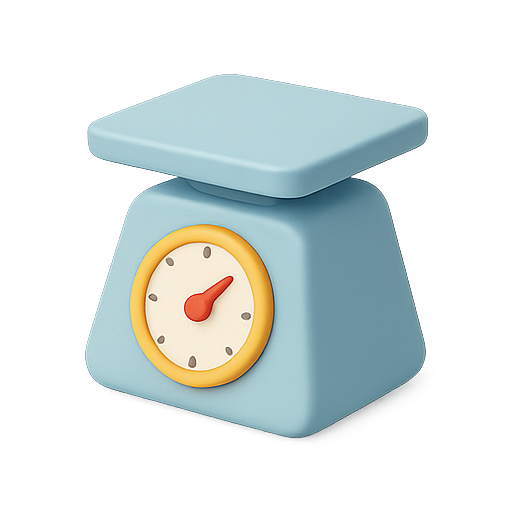 3D rendered illustration of a whimsical kitchen scale featuring a light blue body and a dial with a red indicator, perfect for cooking and baking themes.