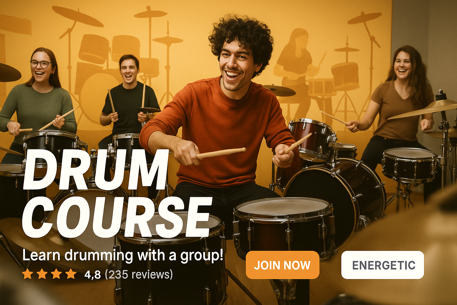 Vibrant promotional graphic showcasing a group drumming class with enthusiastic participants. Ideal for music education marketing.