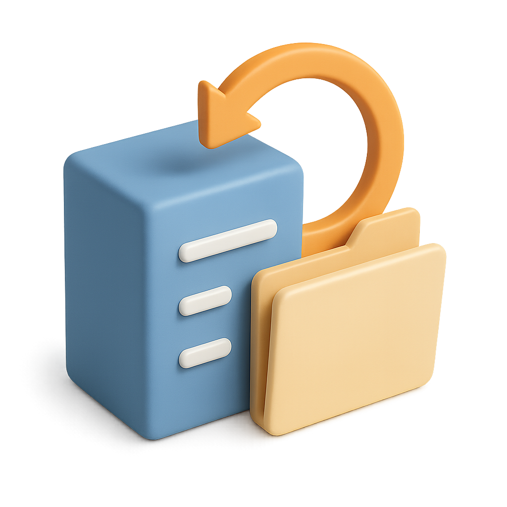 A vibrant 3D backup icon featuring a blue cube and a yellow folder, complemented by an orange circular arrow, all set against a smooth gradient background.
