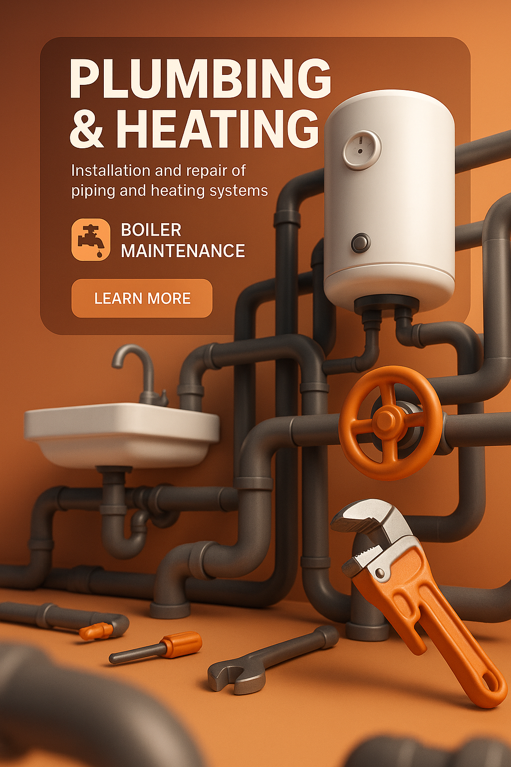 This image showcases plumbing and heating systems with tools, emphasizing installation and repair services. Ideal for promotional materials targeting homeowners.