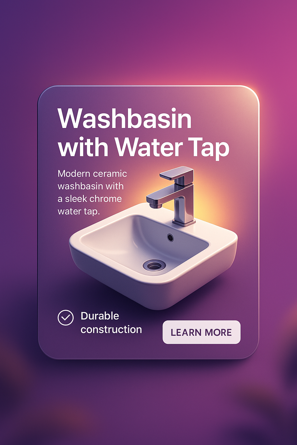 A digital advertisement showcasing a modern ceramic washbasin with a sleek chrome tap. The design is minimalist and stylish, aimed at home improvement enthusiasts.