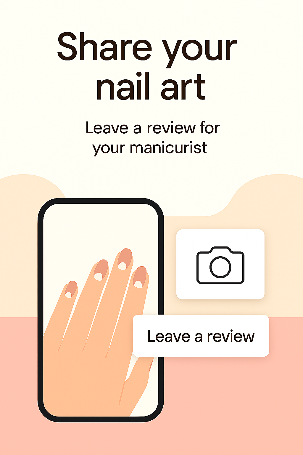 /Collection: /by davooda/Type: PNG/This graphic encourages users to share their nail art and leave reviews for their manicurist. It features a clean, modern design with playful illustrations, ideal for social media engagement.