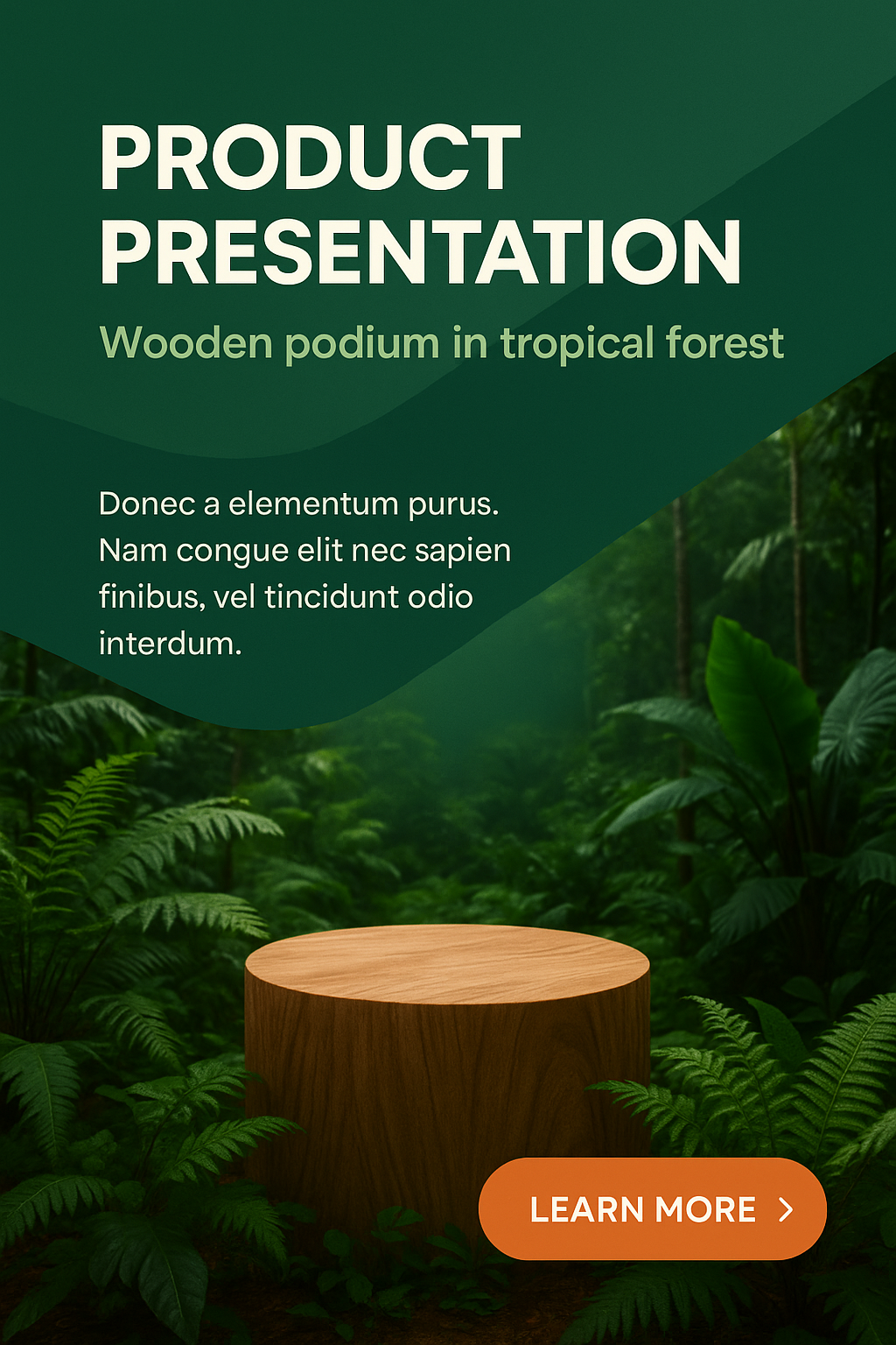 /Collection: /by davooda/Type: PNG/A wooden podium set in a lush tropical forest, designed for product presentations. The image features a balanced composition with clear text elements in a professional aesthetic.