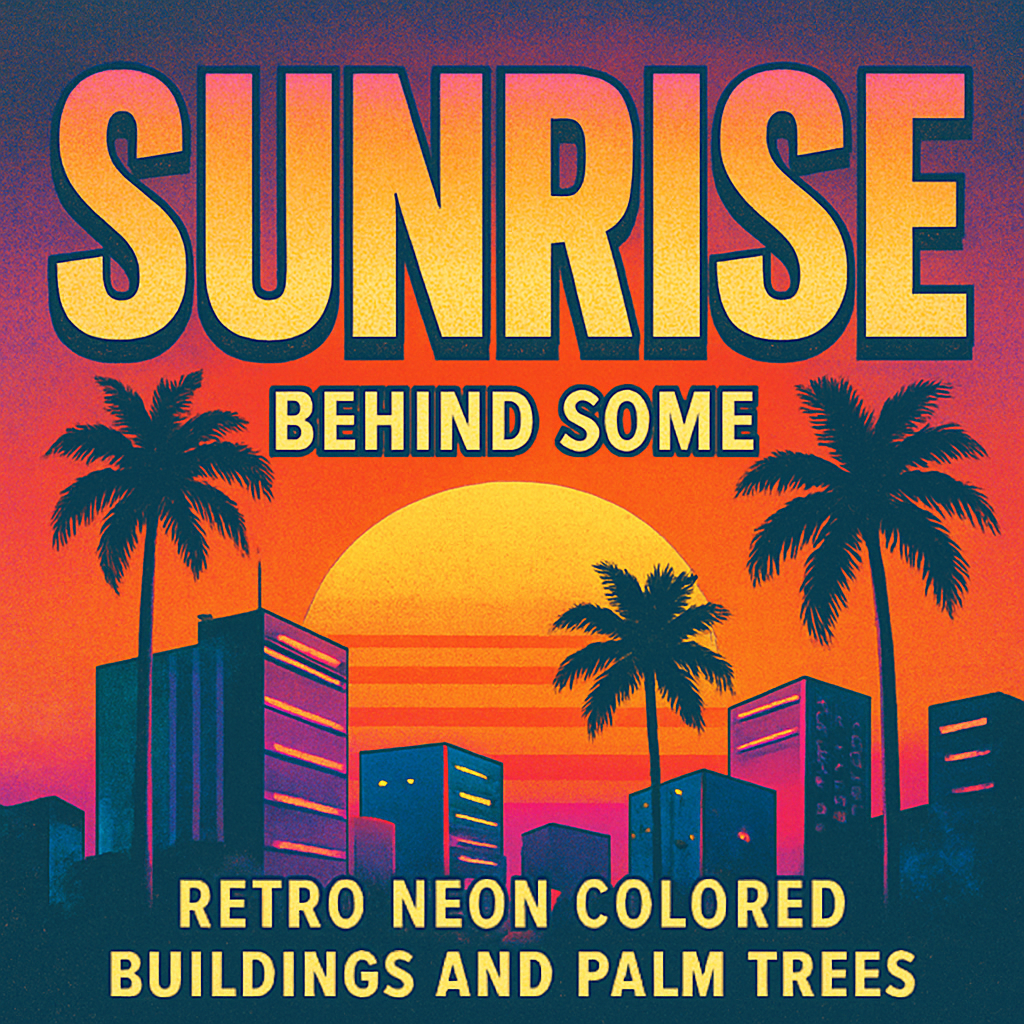 Vibrant retro-style illustration depicting a sunrise behind neon-colored buildings and palm trees, perfect for travel or lifestyle branding.