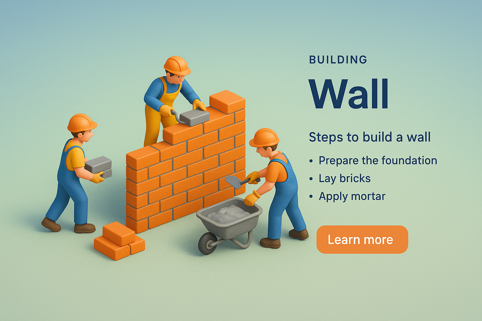 /Collection: /by davooda/Type: PNG/A vibrant 3D illustration showing small workers building a wall. The scene features a smooth gradient background and detailed construction elements, emphasizing a realistic style.