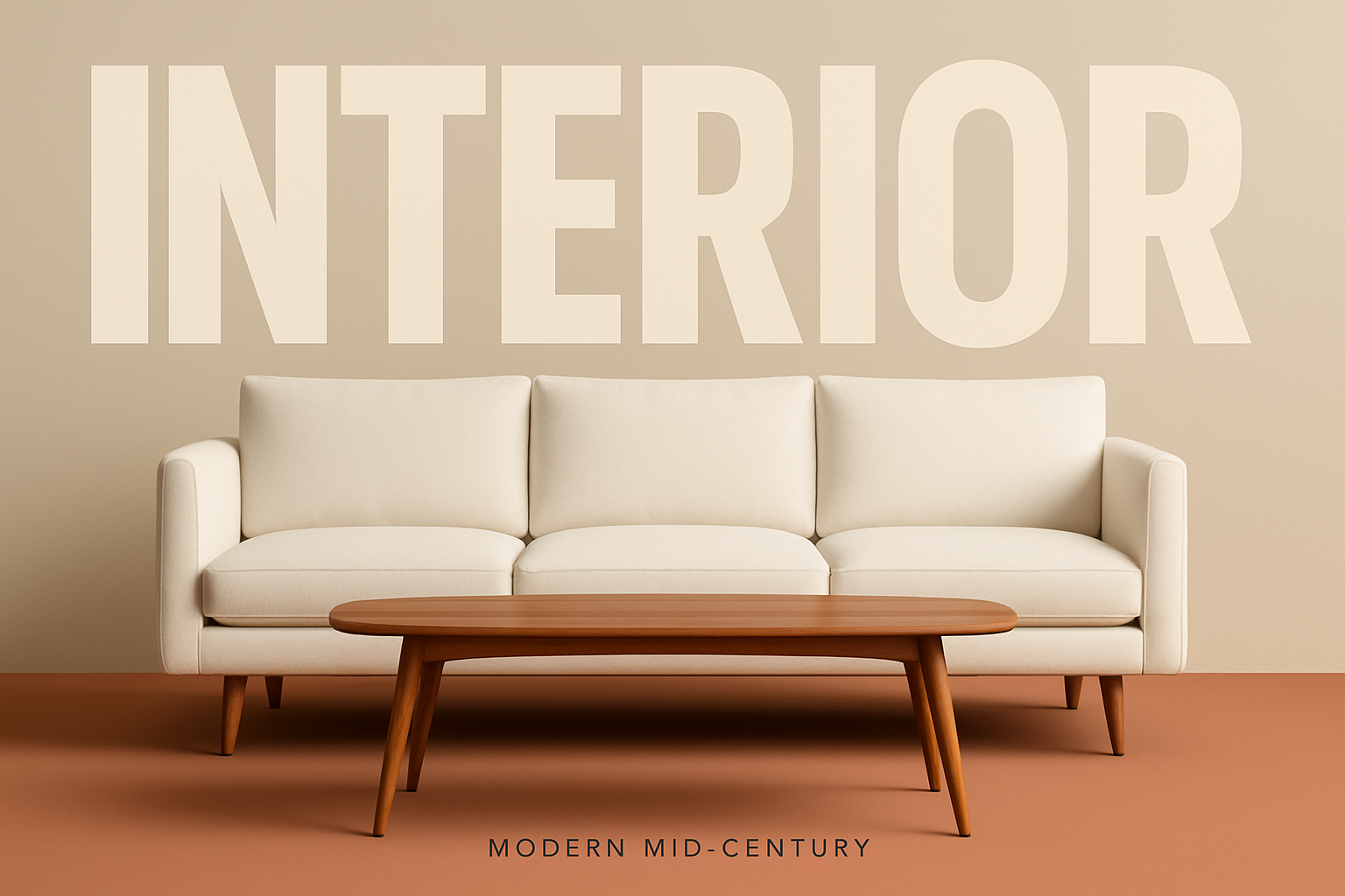 /Collection: /by davooda/Type: PNG/A modern minimalist living room featuring a white sofa and a wooden coffee table against a beige wall. Oversized typography enhances the stylish atmosphere, creating a bold yet balanced composition.