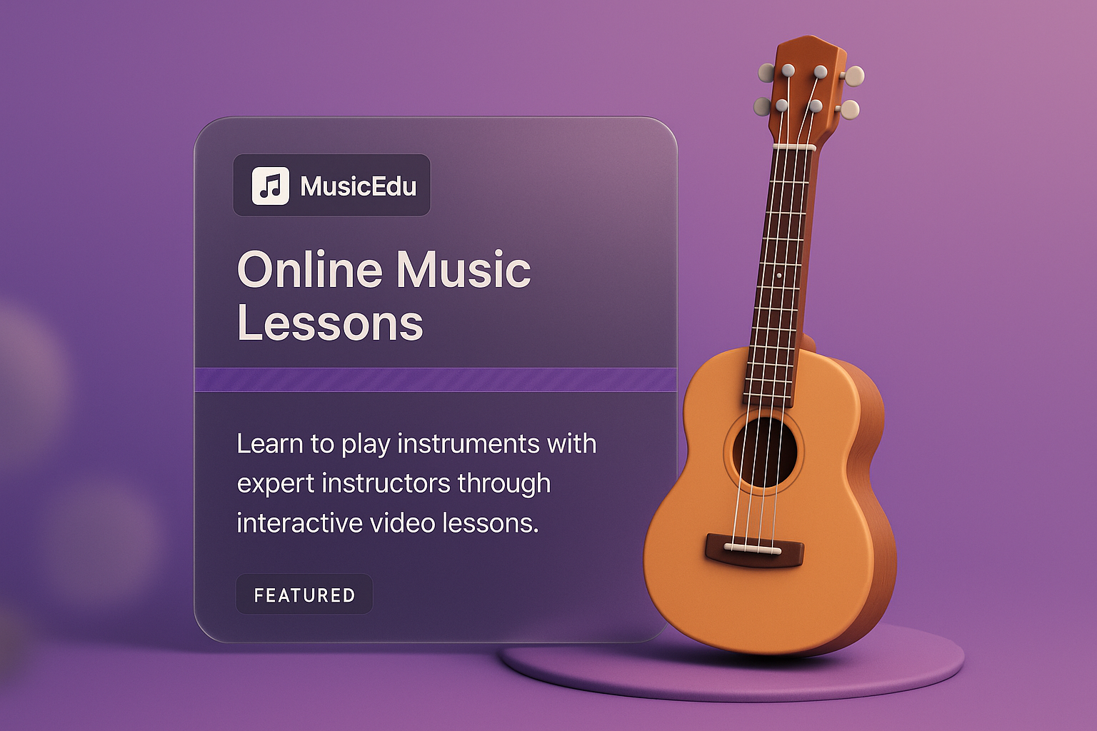 A vibrant 3D illustration featuring a guitar next to a sleek, dark panel promoting interactive music lessons. The design showcases a smooth gradient background, enhancing the visual appeal.