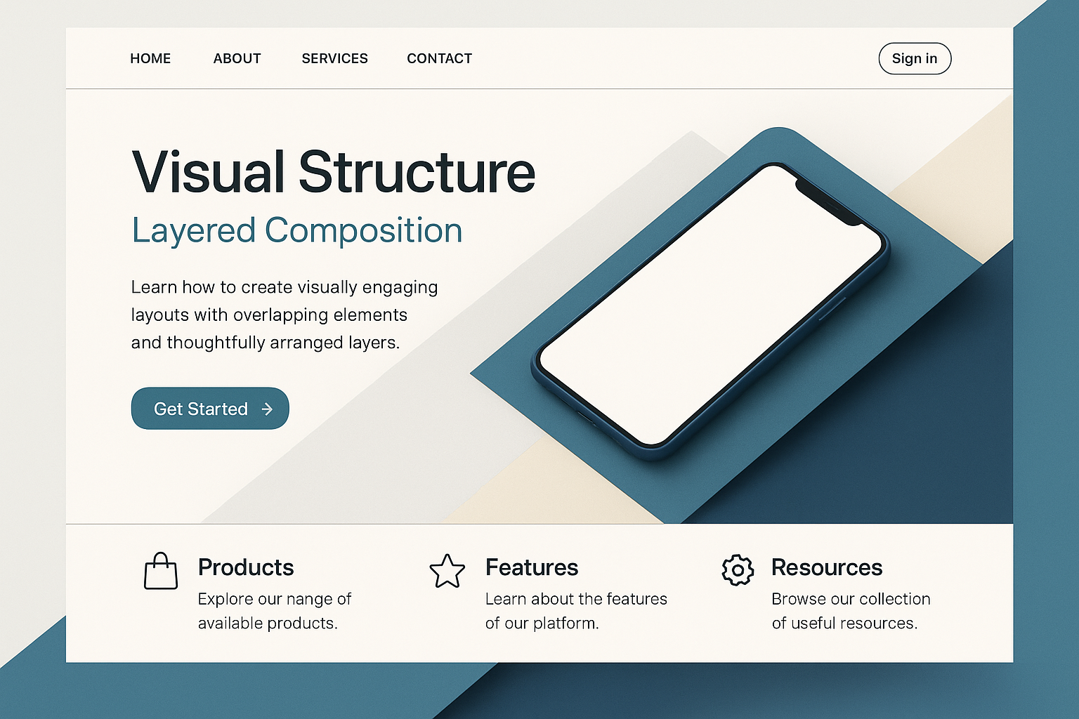 /Collection: /by davooda/Type: PNG/A modern landing page featuring a geometric design with a blue smartphone, clear call-to-action buttons, and sections for products, features, and resources. The layout emphasizes visual structure and layered composition.