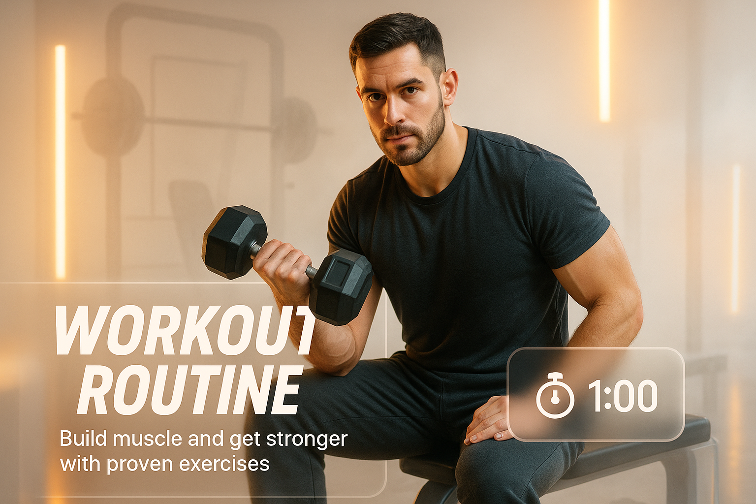 A dynamic fitness image showcasing a man lifting weights, emphasizing a workout routine. The modern design includes a timer and motivational text, ideal for fitness marketing.