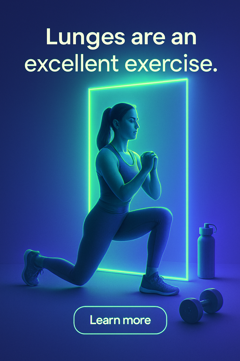A visually striking composition featuring a female figure performing lunges in a shadowy setting. Neon accents and a semi-transparent glass frame enhance the exercise's visual appeal.