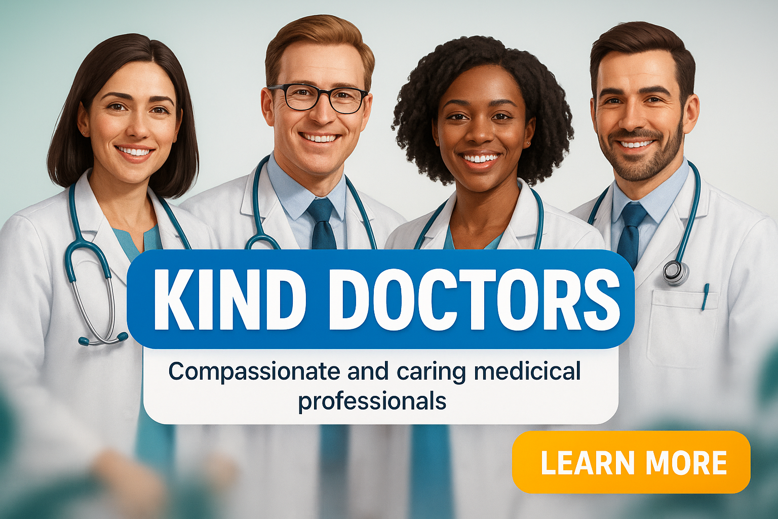 Engaging promotional banner showcasing a diverse group of doctors, emphasizing their compassion and care, ideal for healthcare marketing and recruitment.