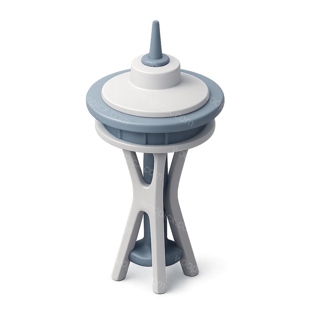 A sleek, stylized 3D icon of the Space Needle in Seattle, featuring a transparent background and a three-quarter isometric view, showcasing a modern design.