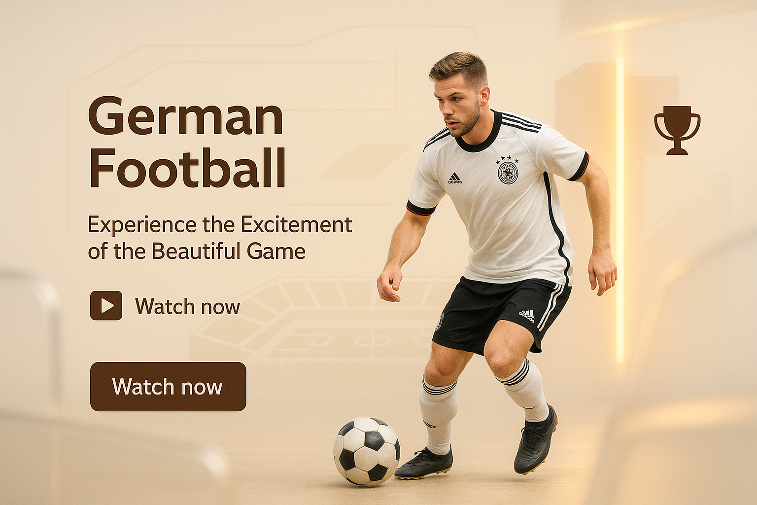 /Collection: /by davooda/Type: PNG/Engaging promotional graphic showcasing a player in action, designed to attract viewers to a German football experience, featuring modern elements and a warm color palette.