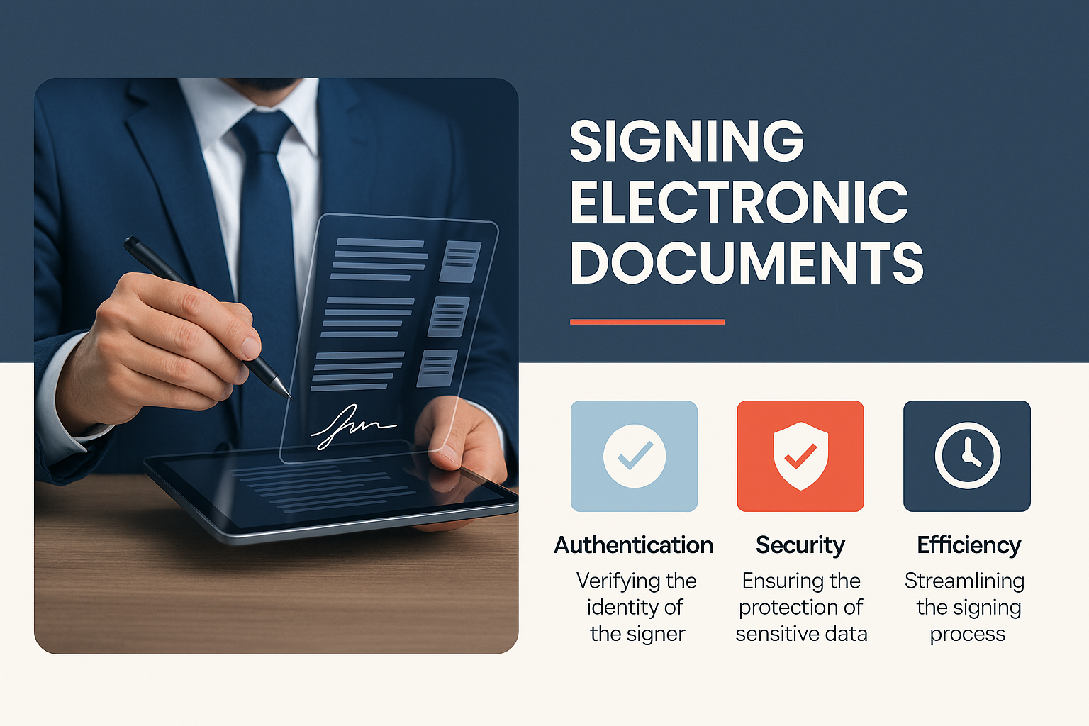 /Collection: /by davooda/Type: PNG/Promotional graphic illustrating the process of signing electronic documents, highlighting benefits like authentication, security, and efficiency. Suitable for digital services marketing.