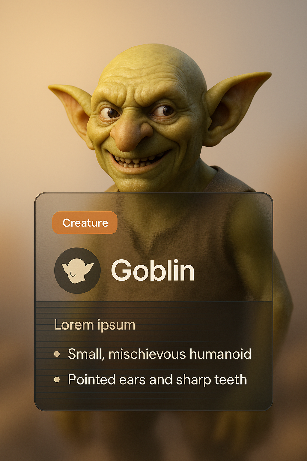 /Collection: /by davooda/Type: PNG/A detailed 3D illustration of a goblin character with pointed ears and sharp teeth. The design features a gradient background and a stylish info block that integrates seamlessly with the character.