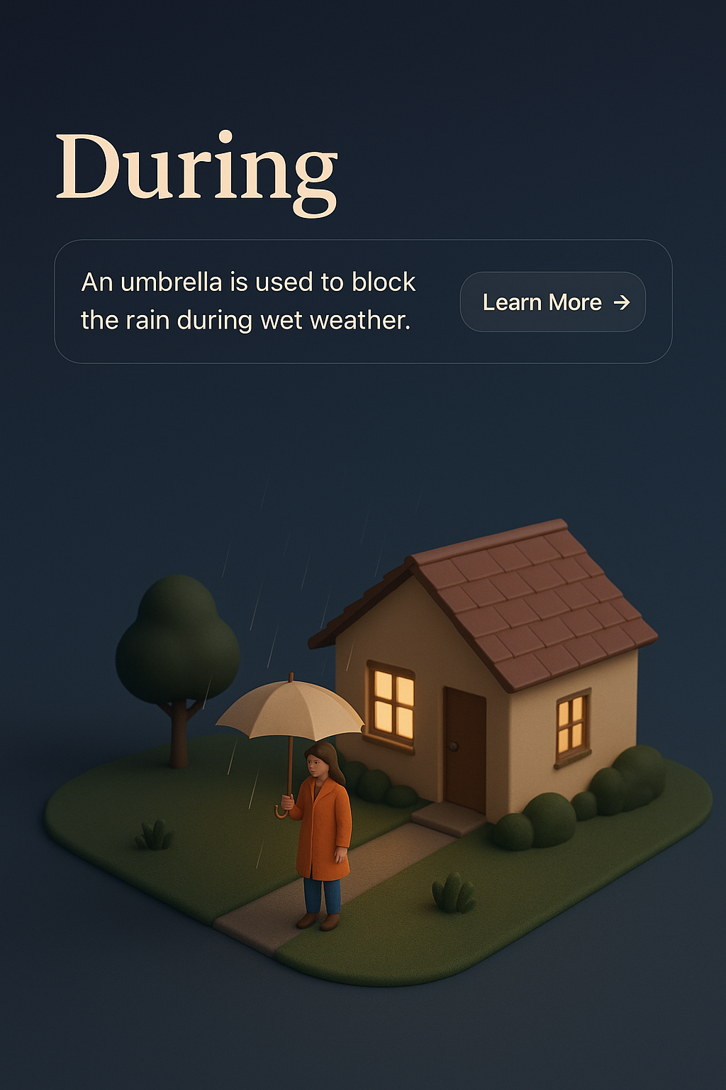 /Collection: /by davooda/Type: PNG/A zoomed-out 3D scene showcasing a small house with a person holding an umbrella in a rainy setting. The dark gradient background enhances the realism of the wet weather.
