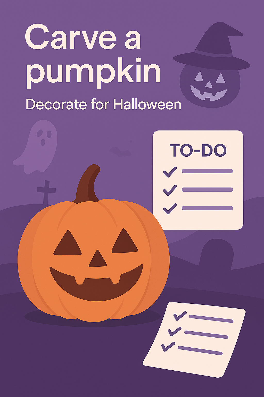 /Collection: /by davooda/Type: PNG/A playful graphic illustrating a pumpkin with a carved face, accompanied by a checklist for Halloween activities. Designed for festive event planning and decoration ideas.