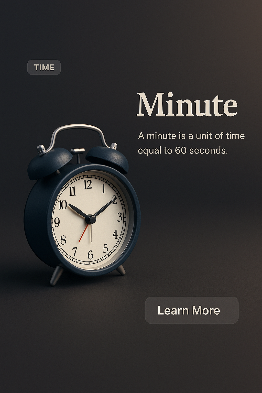 A realistic 3D rendering of a clock emphasizing the concept of a minute, displayed with a dark gradient background. The scene features a small alarm clock with clear text elements.