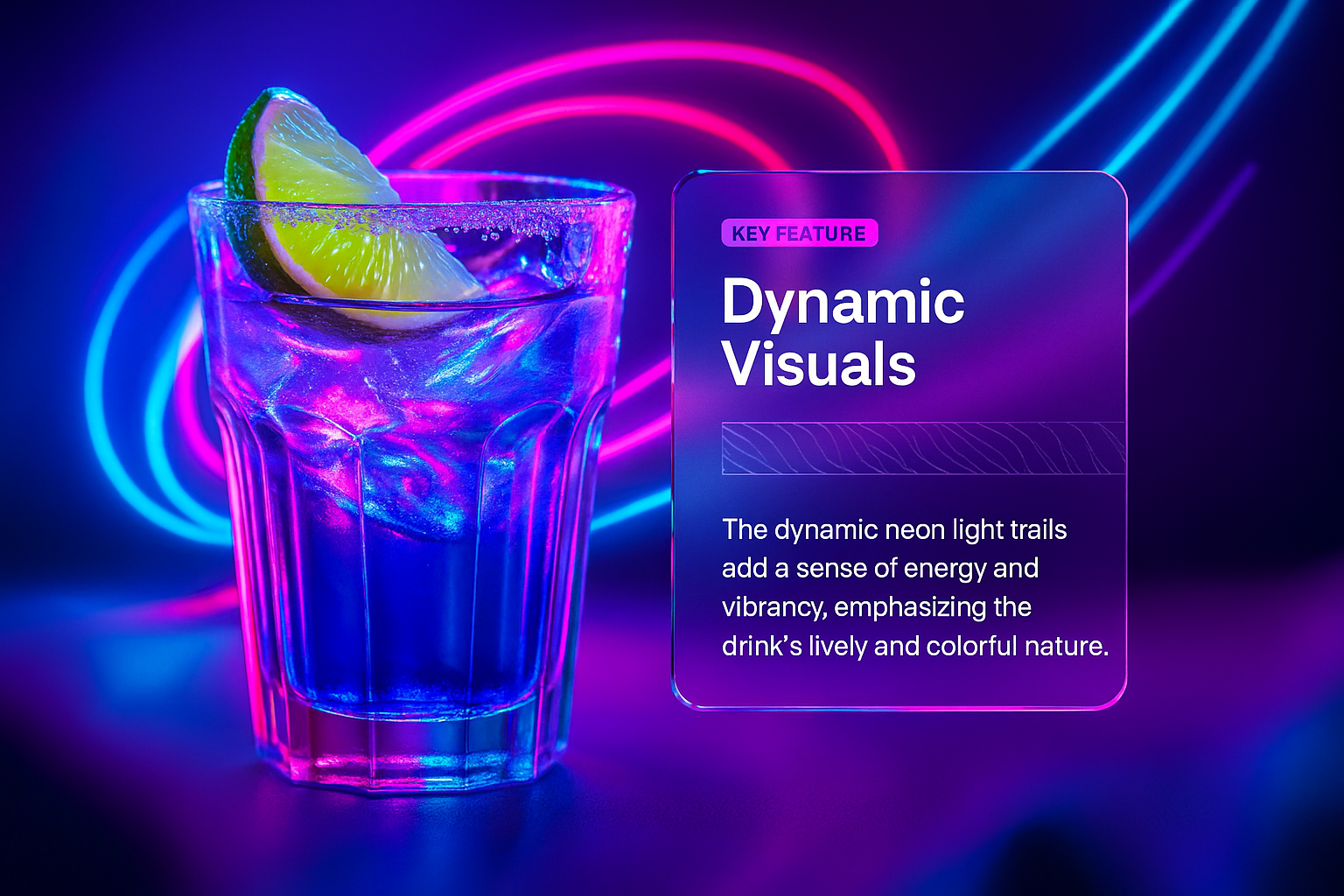 A glass of cocktail illuminated by colorful neon lights, showcasing dynamic trails that enhance its vibrant appearance and lively nature, perfect for rave parties.