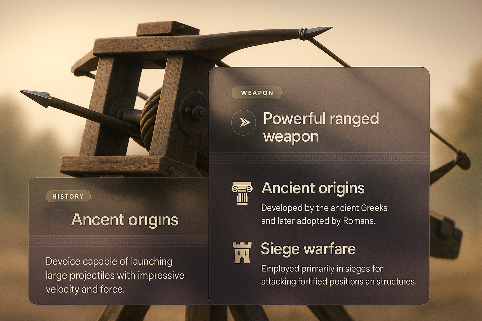 /Collection: /by davooda/Type: PNG/A beautifully designed illustration of a ballista, featuring layered blocks with detailed information on its history and usage. The design incorporates gradient backgrounds and stylish text overlays.