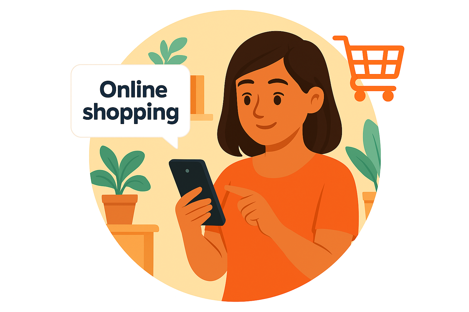 /Collection: /by davooda/Type: PNG/A vibrant circular illustration depicting a person engaged in online shopping on a smartphone. The warm color palette and plant motifs create a welcoming atmosphere, ideal for e-commerce content.