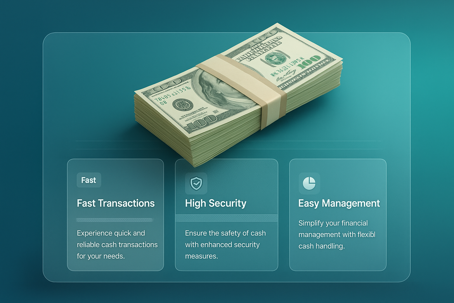 A 3D illustration of a cash stack displayed against a smooth gradient background. Feature blocks highlight transaction speed, security, and management, integrating seamlessly.