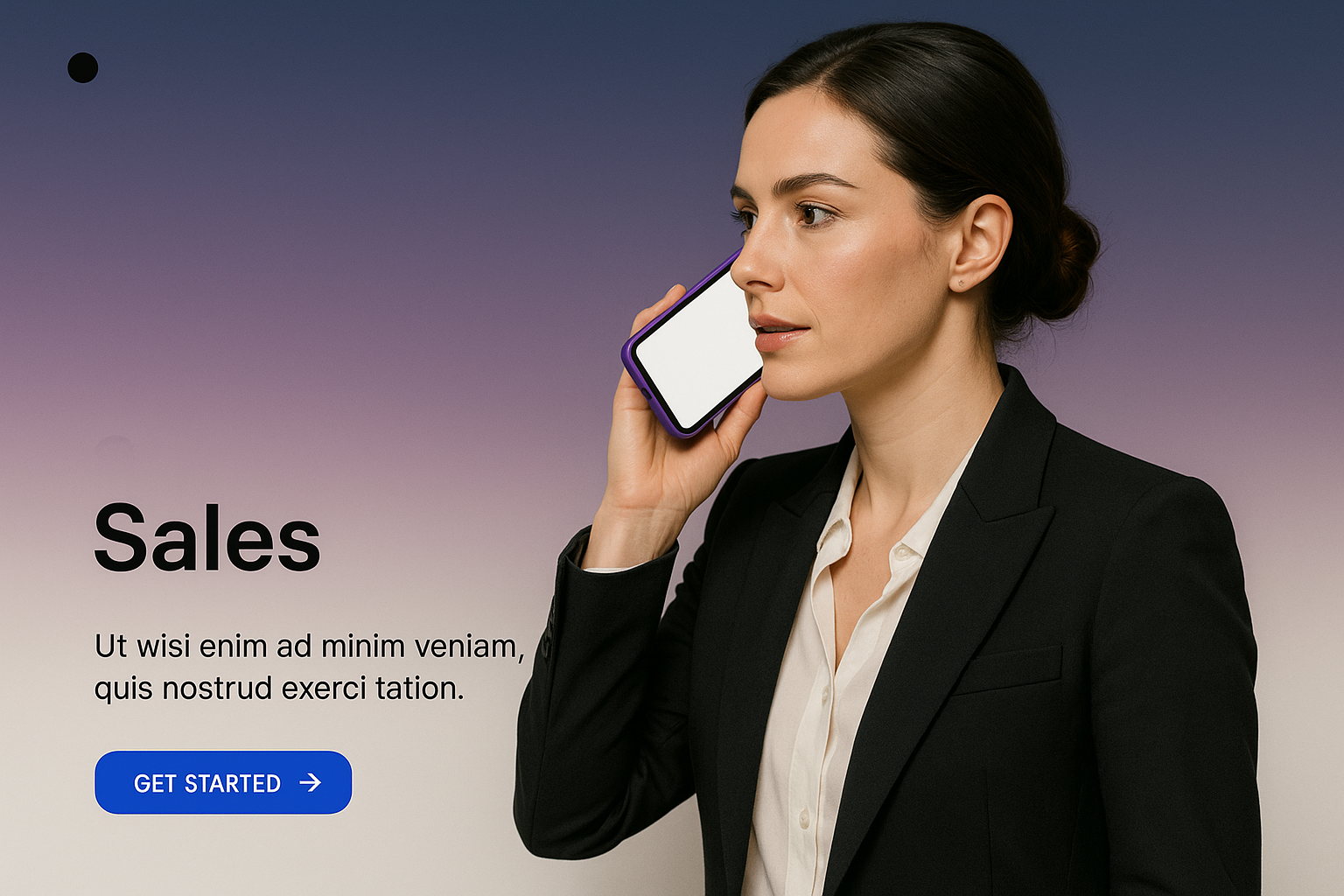 A professional businesswoman in a suit holds a purple phone to her ear, set against a gradient background. The image conveys a sense of modern business communication.