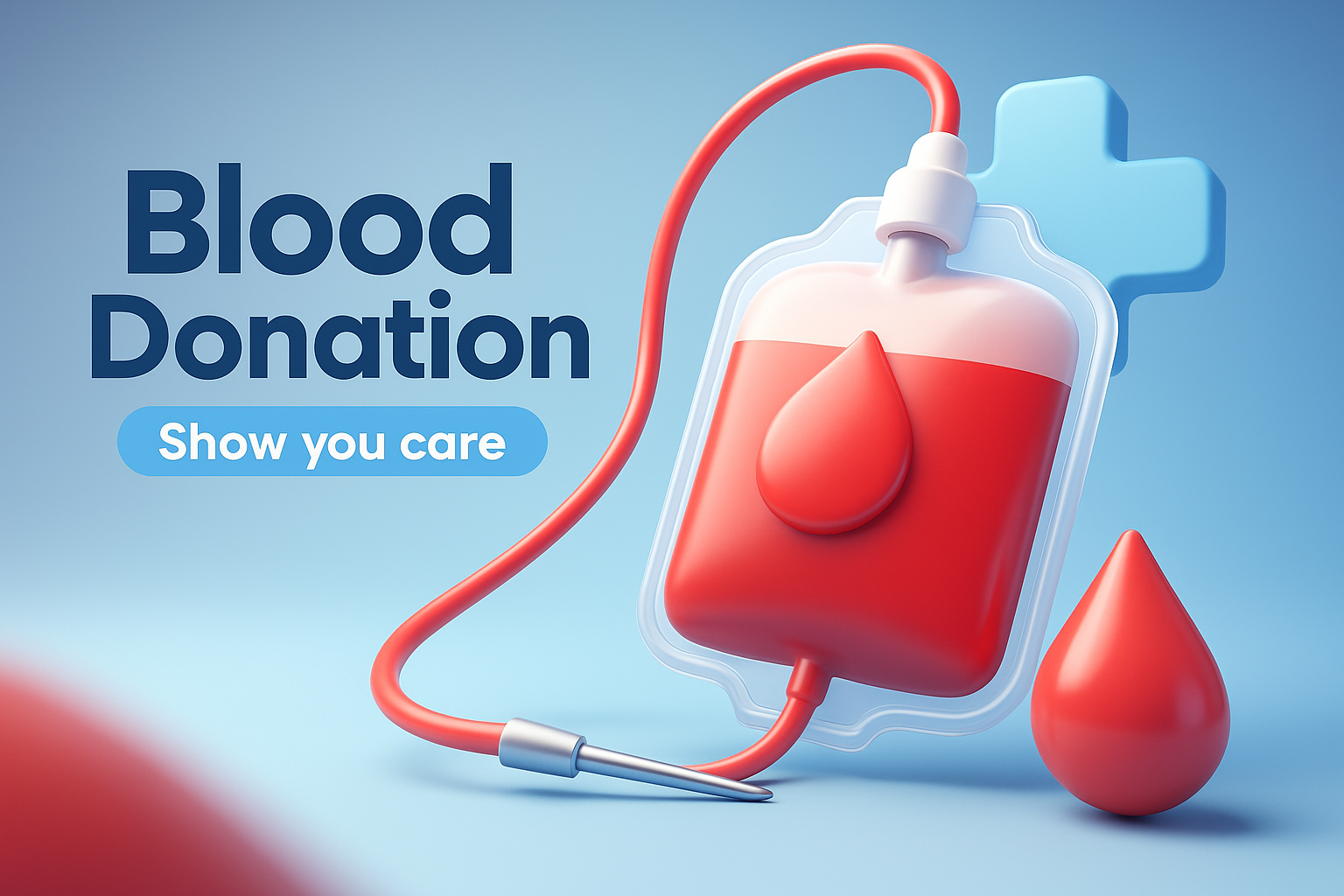 A vibrant 3D illustration featuring a blood donation bag and drop, emphasizing the theme of charity. The design uses a smooth gradient background, ensuring a professional and engaging aesthetic.