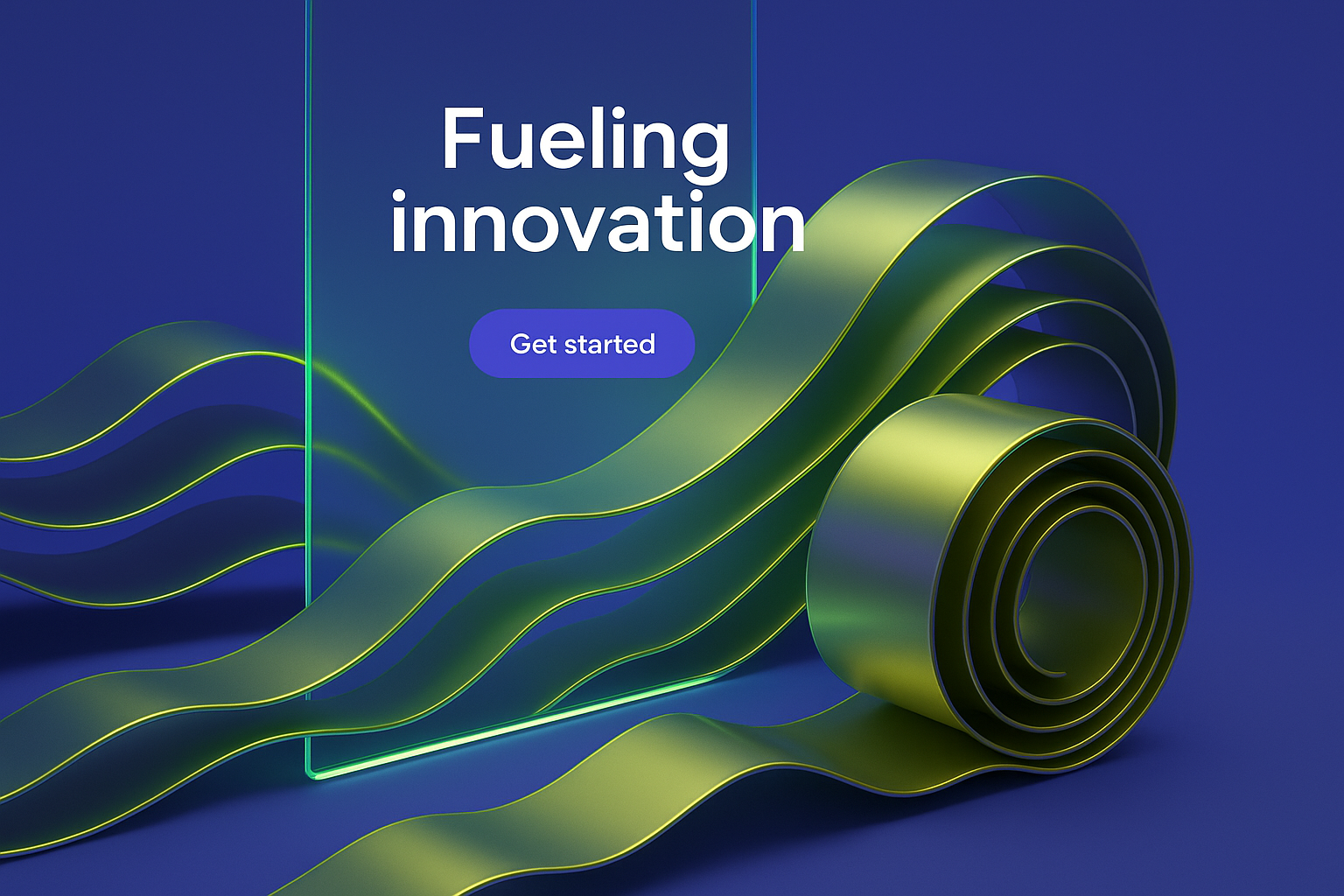 /Collection: /by davooda/Type: PNG/An abstract composition featuring a rolled-up metallic ribbon, layered in hues of yellow-green and blue. Neon accents illuminate the scene, creating a vibrant atmosphere against a solid blue background.