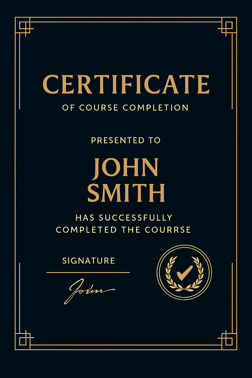 /Collection: /by Sergey Leonov/Type: PNG/Formal certificate design featuring gold typography and decorative borders, ideal for educational institutions or online courses to acknowledge successful completion.
