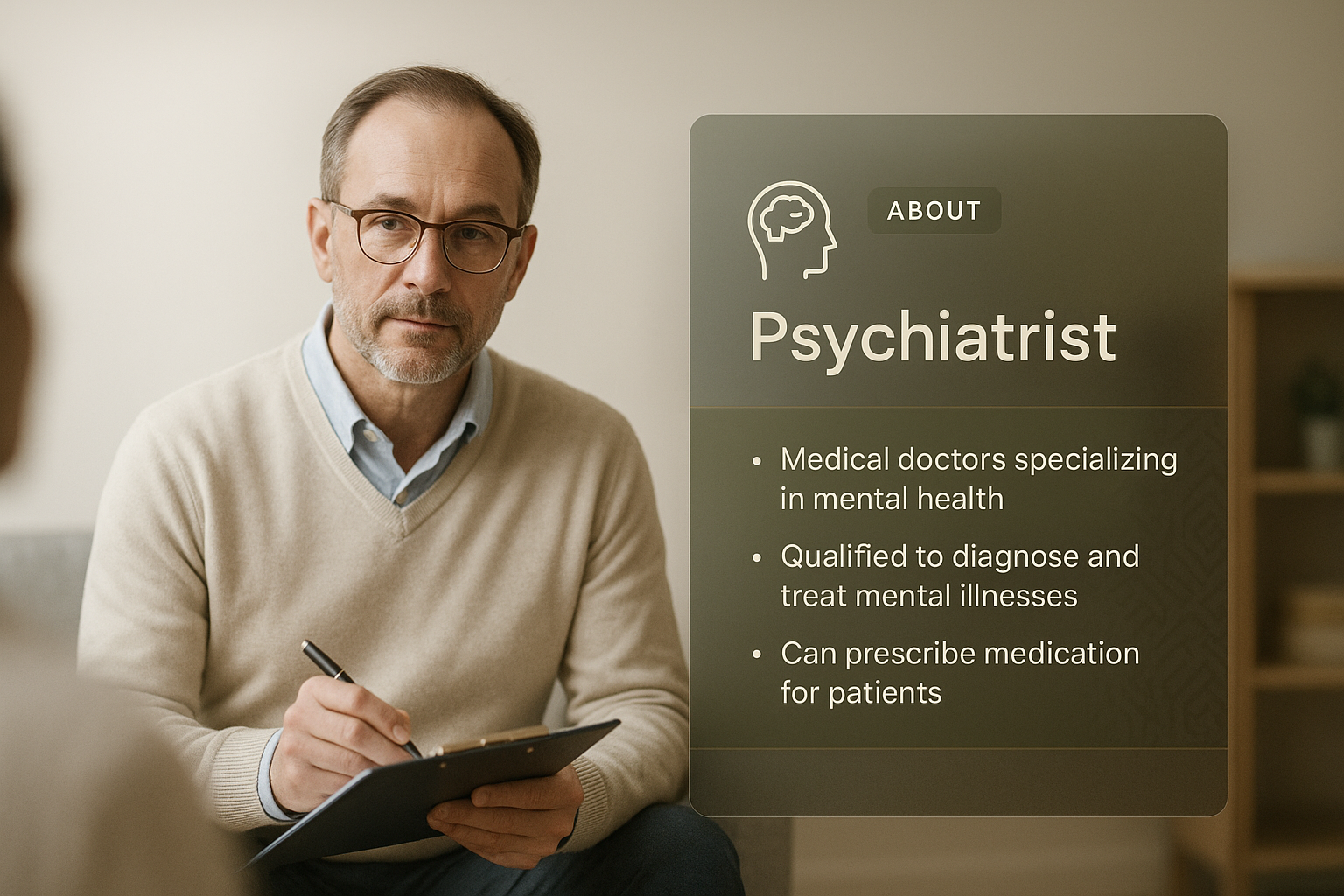 /Collection: /by davooda/Type: PNG/A professional psychiatrist sits in a light, modern office, holding a clipboard. The image features a clean design with an informative block highlighting the psychiatrist's role.