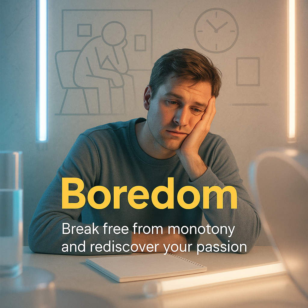 /Collection: /by davooda/Type: PNG/A thought-provoking image showcasing a man reflecting on boredom, highlighted by modern lighting and minimalist background, ideal for mental health or motivational content.