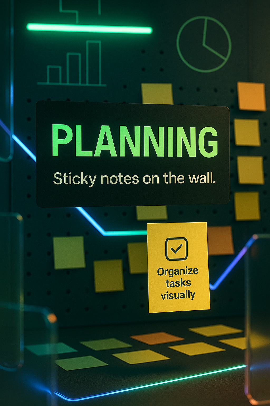 /Collection: /by davooda/Type: PNG/A modern workspace representation featuring sticky notes and neon elements, designed to illustrate task organization and planning. Ideal for productivity-themed content.