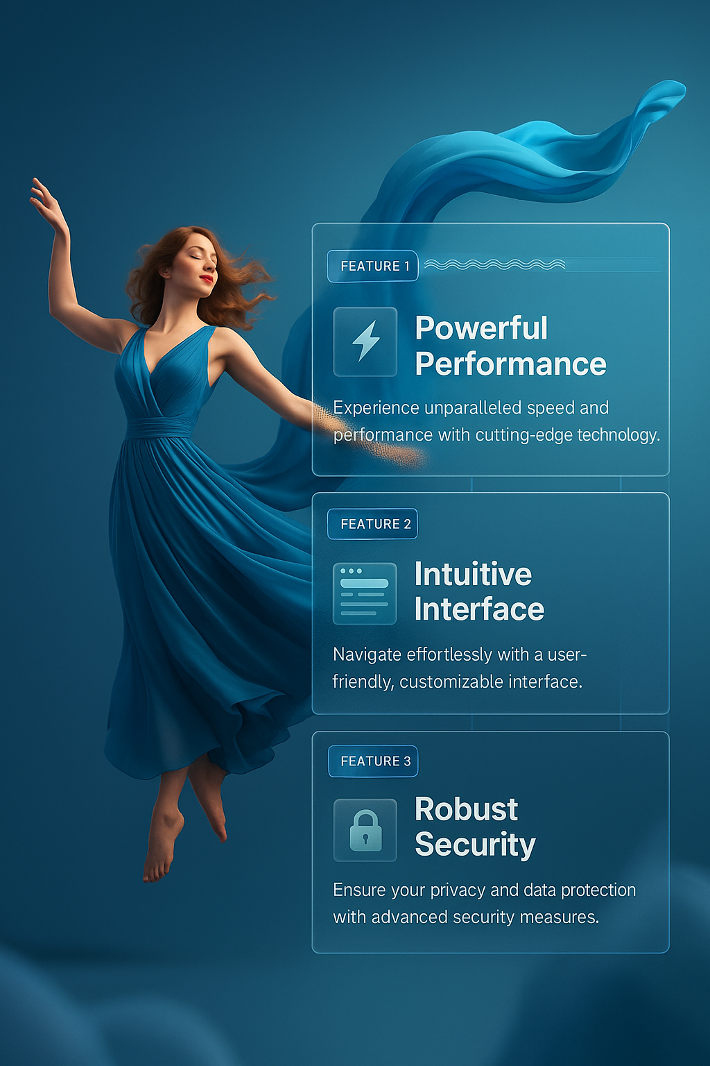 /Collection: /by davooda/Type: PNG/A graceful woman in a blue dress is captured mid-motion, with fabric flowing around her. Three feature blocks highlight performance, interface, and security, blending seamlessly with the background.
