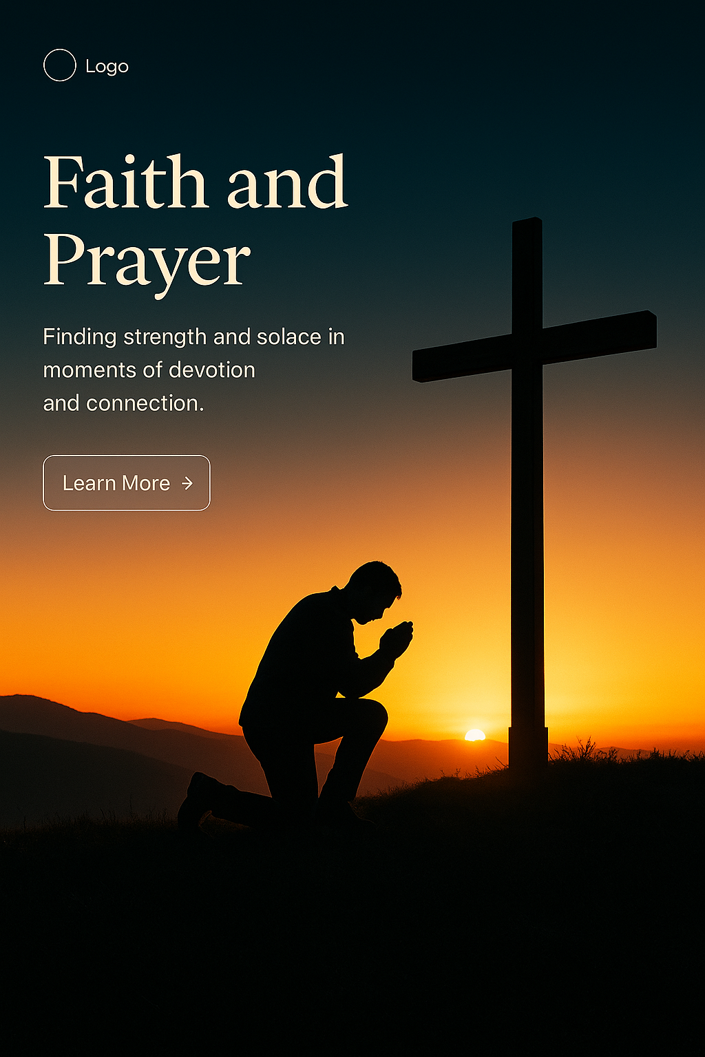 /Collection: /by davooda/Type: PNG/A serene silhouette of a man kneeling in prayer at the foot of a cross during a vibrant sunrise. The scene captures a moment of devotion, framed by a gradient sky transitioning from dark to light.