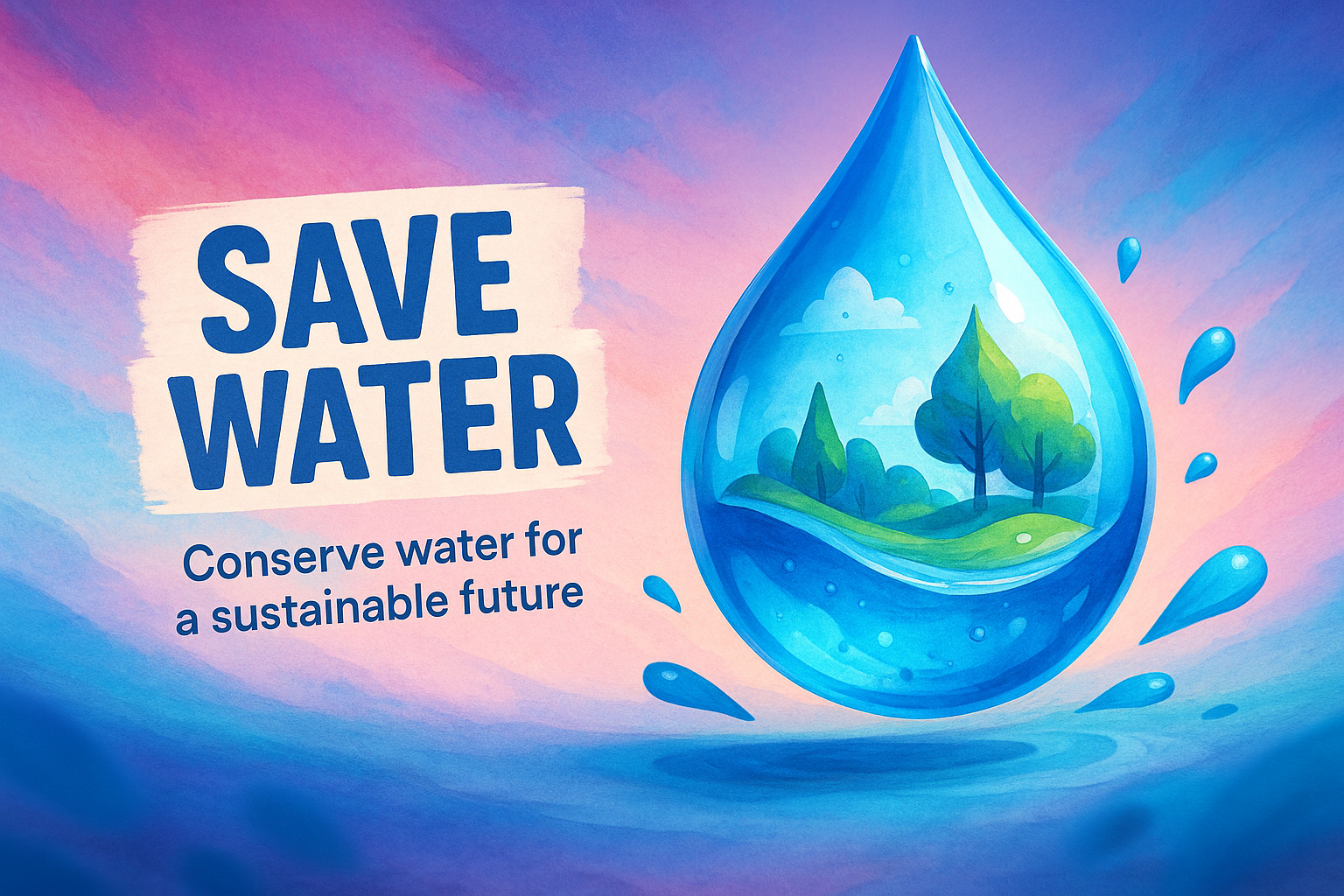 Colorful illustration promoting water conservation featuring a stylized water droplet with a landscape inside, aimed at raising awareness for sustainability.