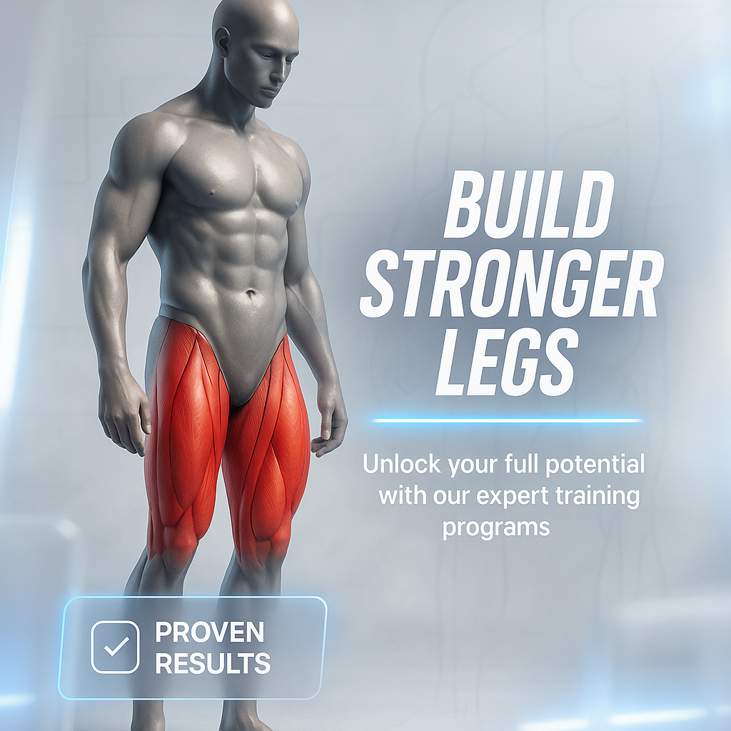 Dynamic fitness promotional graphic featuring a muscular figure emphasizing leg muscles, ideal for marketing training programs aimed at strength building.