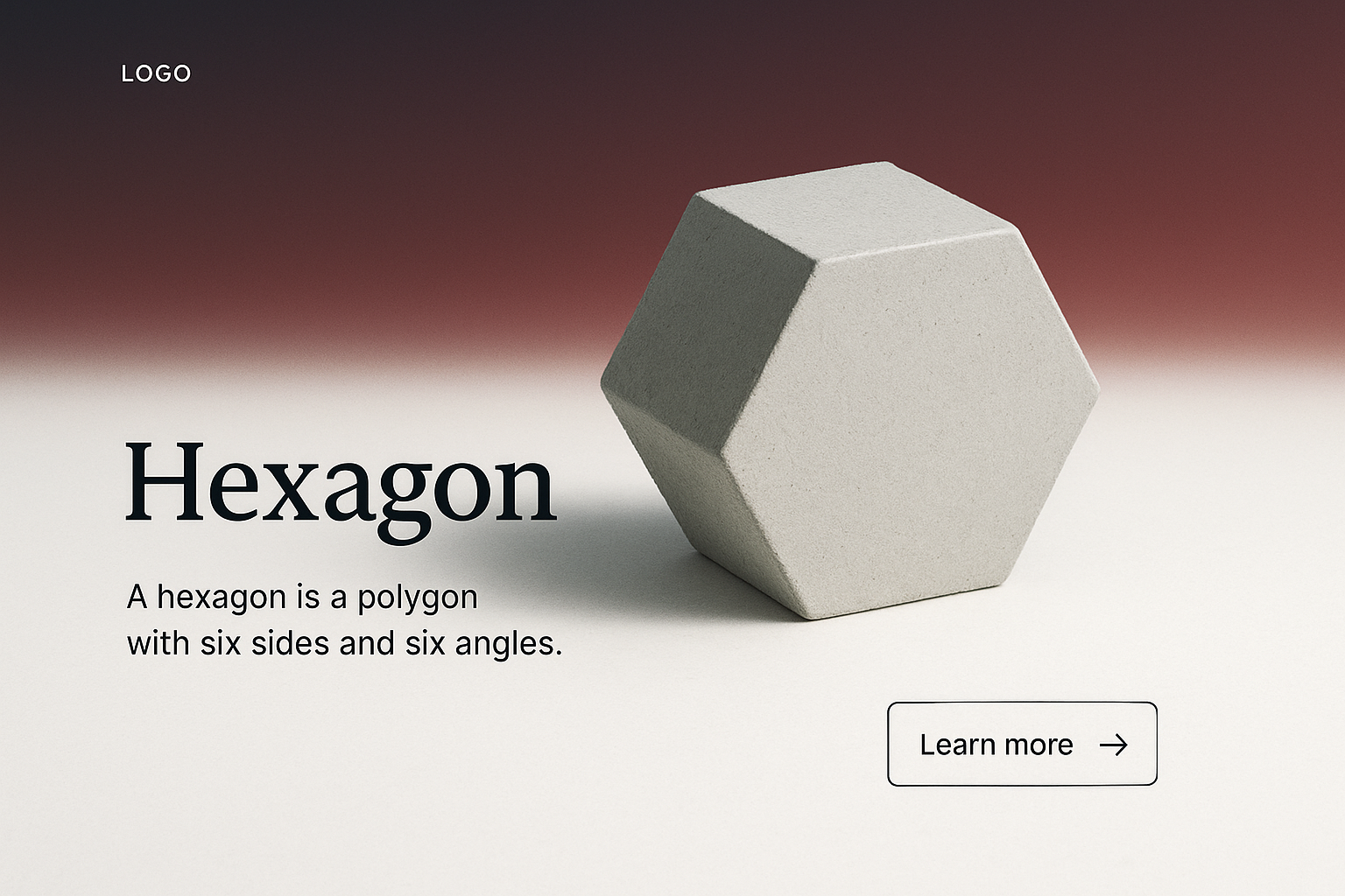 A modern web design showcasing a hexagonal shape with a gradient background, incorporating a logo, title, descriptive text, and a call-to-action button.