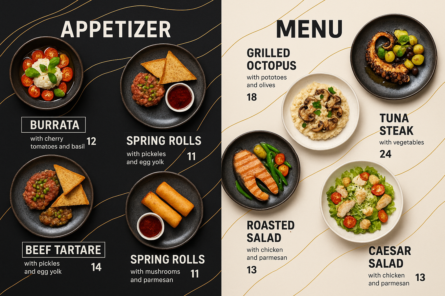 A modern gastro-bar menu featuring a stylish design with dark and light backgrounds. Each dish is presented in a realistic top view, complemented by bold typography and golden accents.