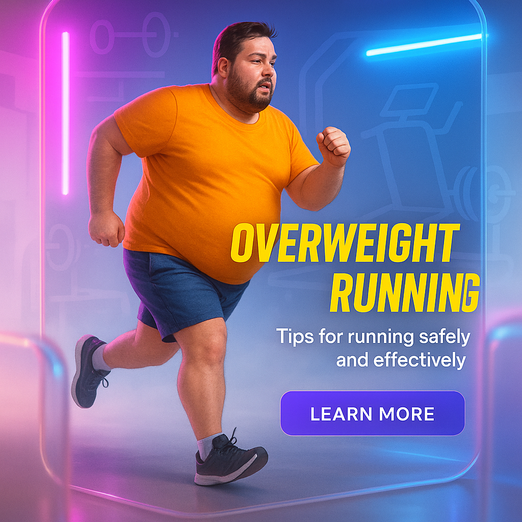 /Collection: /by davooda/Type: PNG/Dynamic social media post featuring a man running, promoting tips for overweight individuals to run safely and effectively. The design incorporates vibrant colors and modern aesthetics, ideal for fitness awareness campaigns.