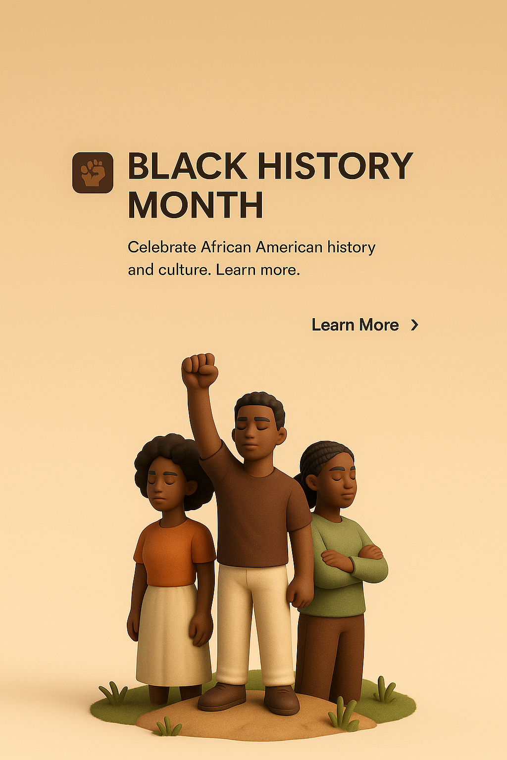 /Collection: /by davooda/Type: PNG/A 3D illustration depicting unity among three African American figures, symbolizing strength and empowerment for Black History Month. The scene includes a gradient background and text elements.