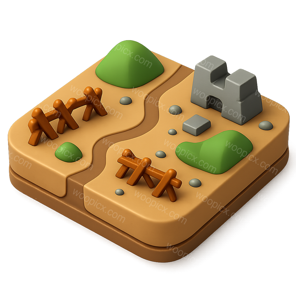A stylized 3D icon depicting a battleground scene with hills, fences, and a castle. The design features an isometric perspective and a transparent background, enhancing its volumetric feel.