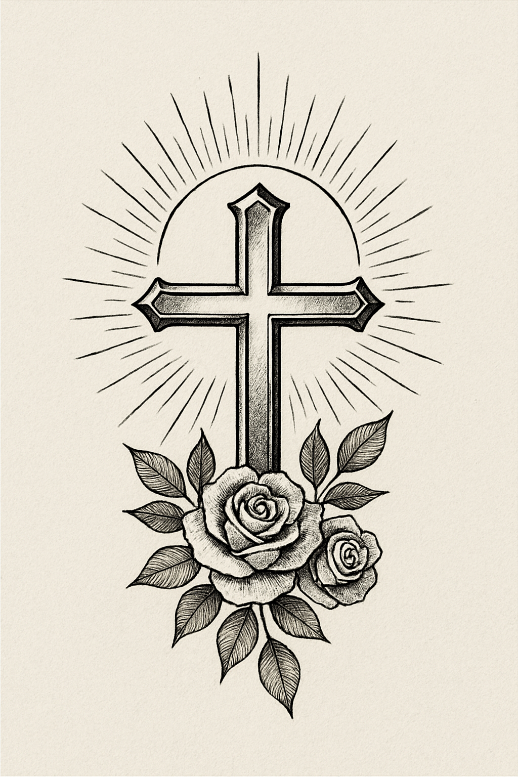 Stylized Cross with Roses and Radiating Light