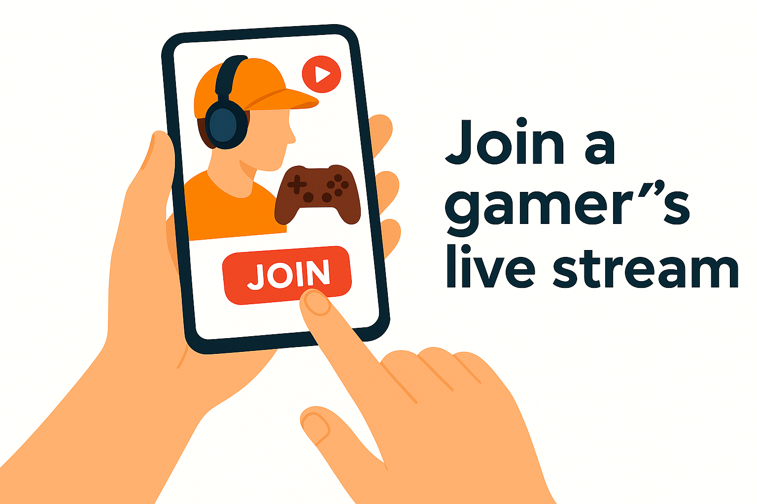 /Collection: /by davooda/Type: PNG/Digital illustration showcasing a smartphone with a gamer inviting viewers to join a live stream, featuring a modern and engaging design aimed at gaming enthusiasts.