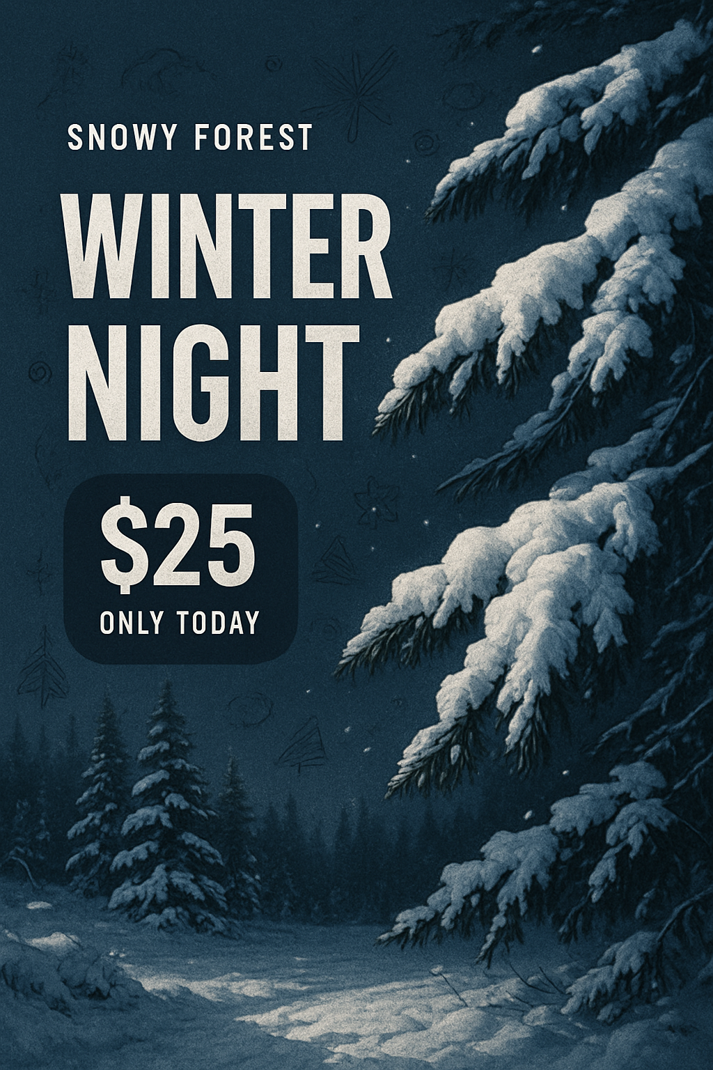 /Collection: /by davooda/Type: PNG/A modern advertisement featuring a snowy forest landscape at night. The design includes bold typography and a clear price tag, creating a striking visual appeal.