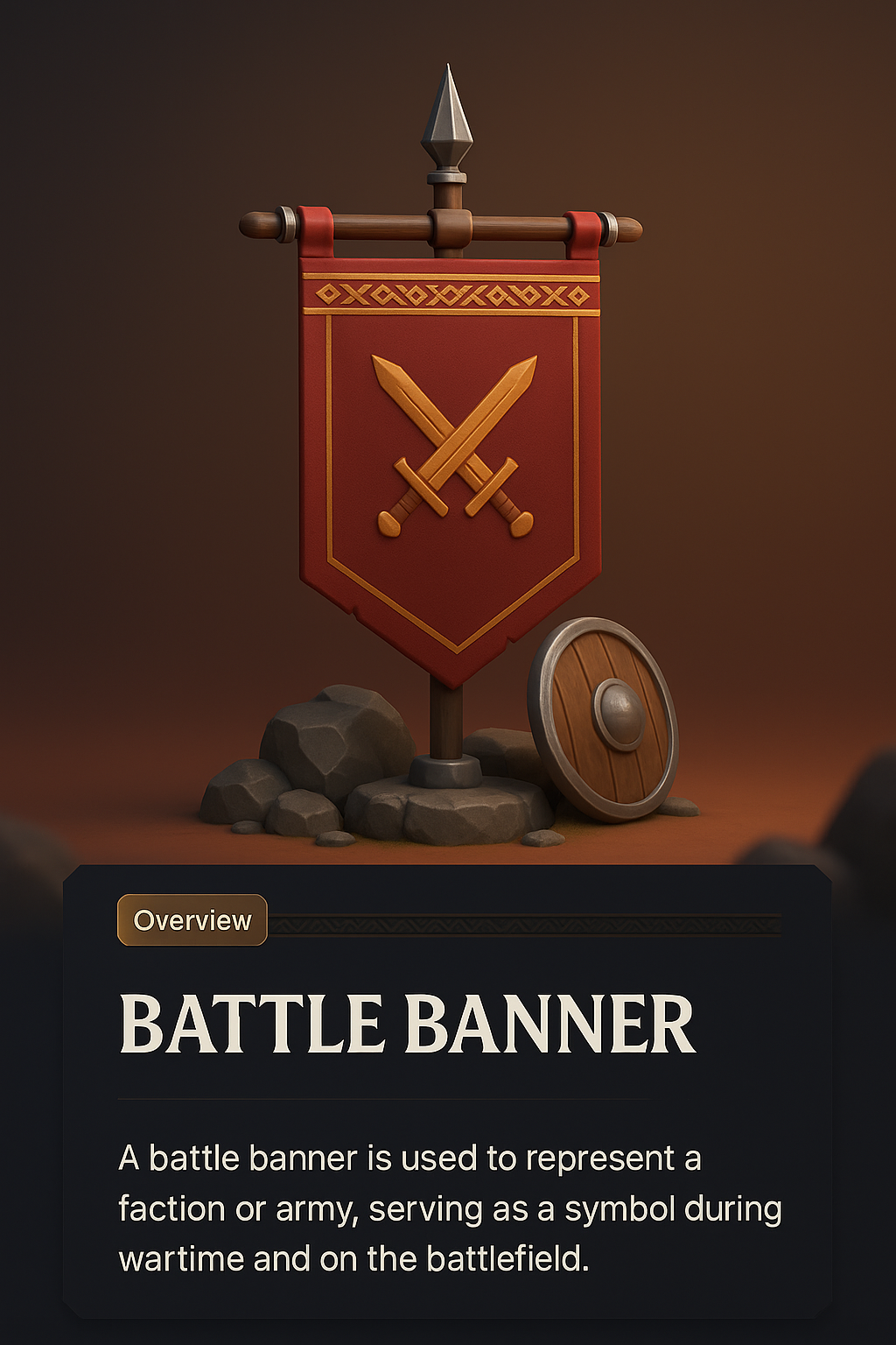 /Collection: /by davooda/Type: PNG/A visually striking 3D battle banner illustration features a red flag with crossed swords, supported by a shield and rocks. Includes a dark overlay block with text.