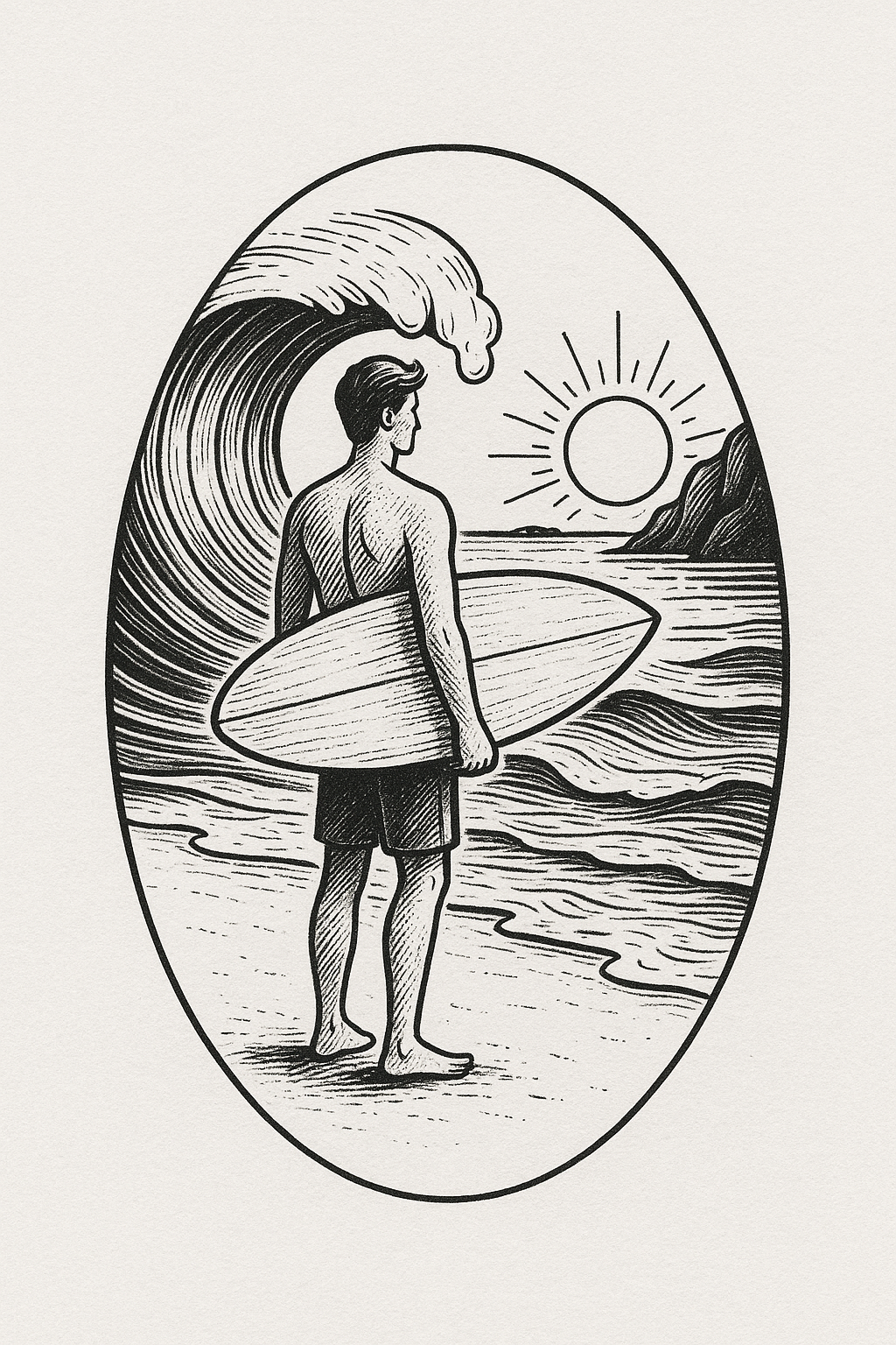 A monochromatic illustration of a surfer gazing at the ocean waves and setting sun. Ideal for beach-themed designs, surf culture promotions, or lifestyle branding.